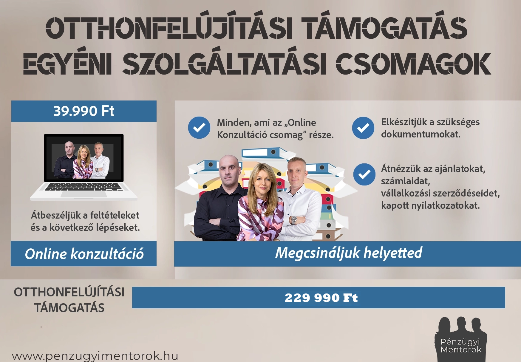 Ha megvásároltad a tudásanyagunkat, úgy annak árát beszámítjuk a konzultáció és megcsináljuk helyetted csomagjainkba is. Használd a csomag megvásárlásakor kapott kuponkódot és máris 20 000 Ft-ért konzultálhatsz velünk.